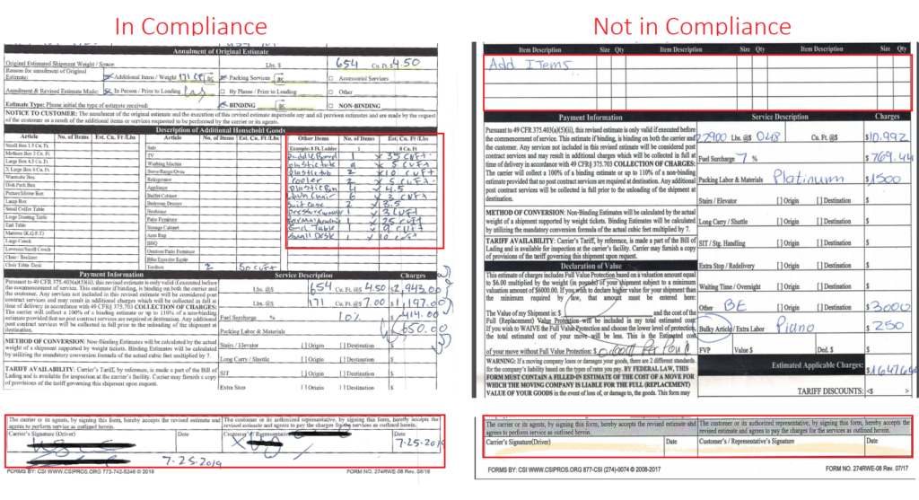Tell me if this sounds familiar: You arrive at a customer’s home for a pickup. The customer unexpectedly now asks your crew to pack and ship double the pieces/volume than what they had advised for the Original Estimate. Now you are strapped for time and running late, so you add these items on the descriptive inventory list, grab a Revised Estimate and write “additional Items – 500 cu ft” and have the customer sign. This is illegal!
